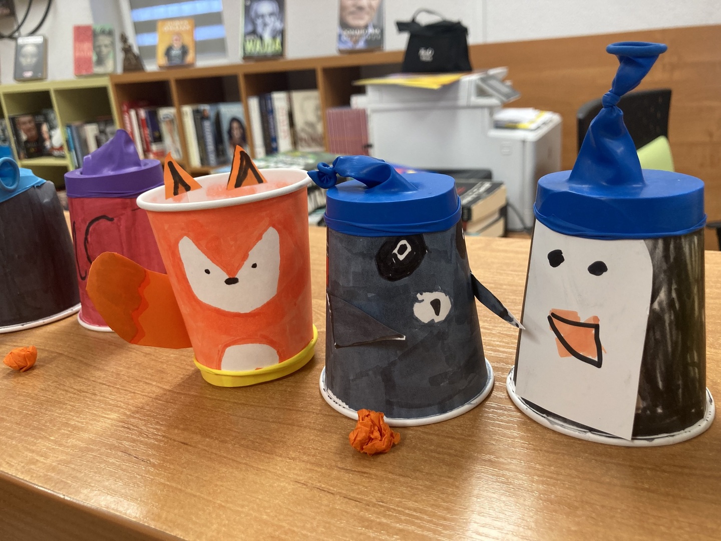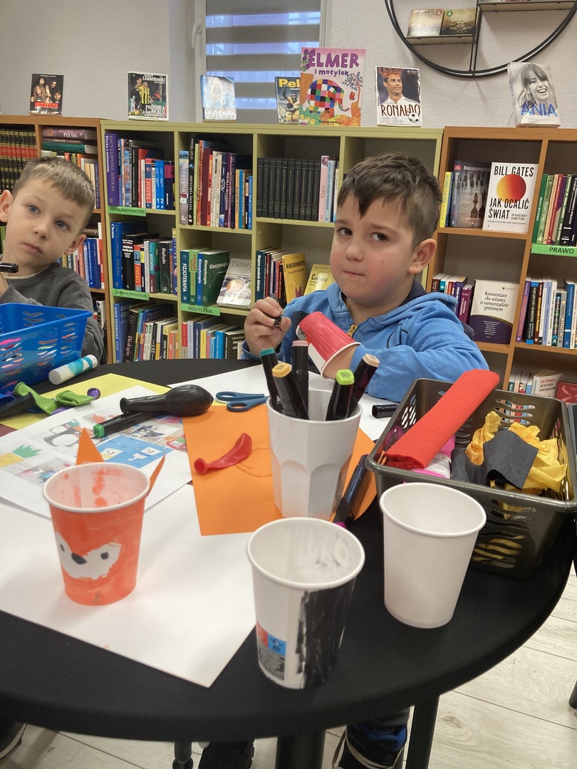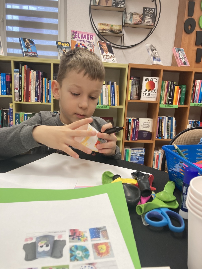 Uczestnicy środowych warsztatów, wykorzystując kubki papierowe , balony, kolorowe kartki projektowali wyrzutnie na konfetti. Powstały wystrzałowe, kreatywne zabawki.