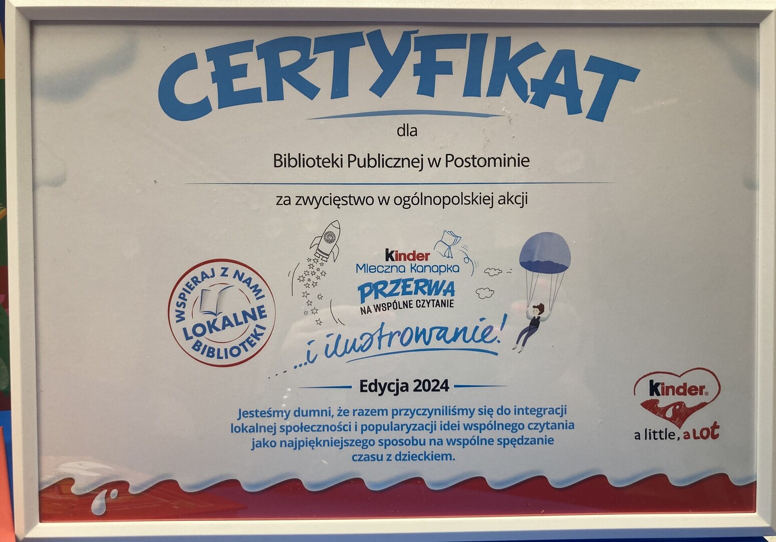 Z ogromną radością informujemy, że Biblioteka Publiczna w Postominie znalazła się wśród grona nagrodzonych w akcji Kinder Mleczna Kanapka „Przerwa na wspólne czytanie”. Przez kilkadziesiąt dni nasi przyjaciele i czytelnicy wytrwale oddawali głosy na naszą bibliotekę. Dziękujemy serdecznie za każdy oddany głos, wsparcie i Wasze zaangażowanie! Udało nam się zebrać 4760 głosów, co pozwoliło nam zająć 17 miejsce wśród 100 nagrodzonych placówek spośród kilku tysięcy bibliotek z całej Polski!!!