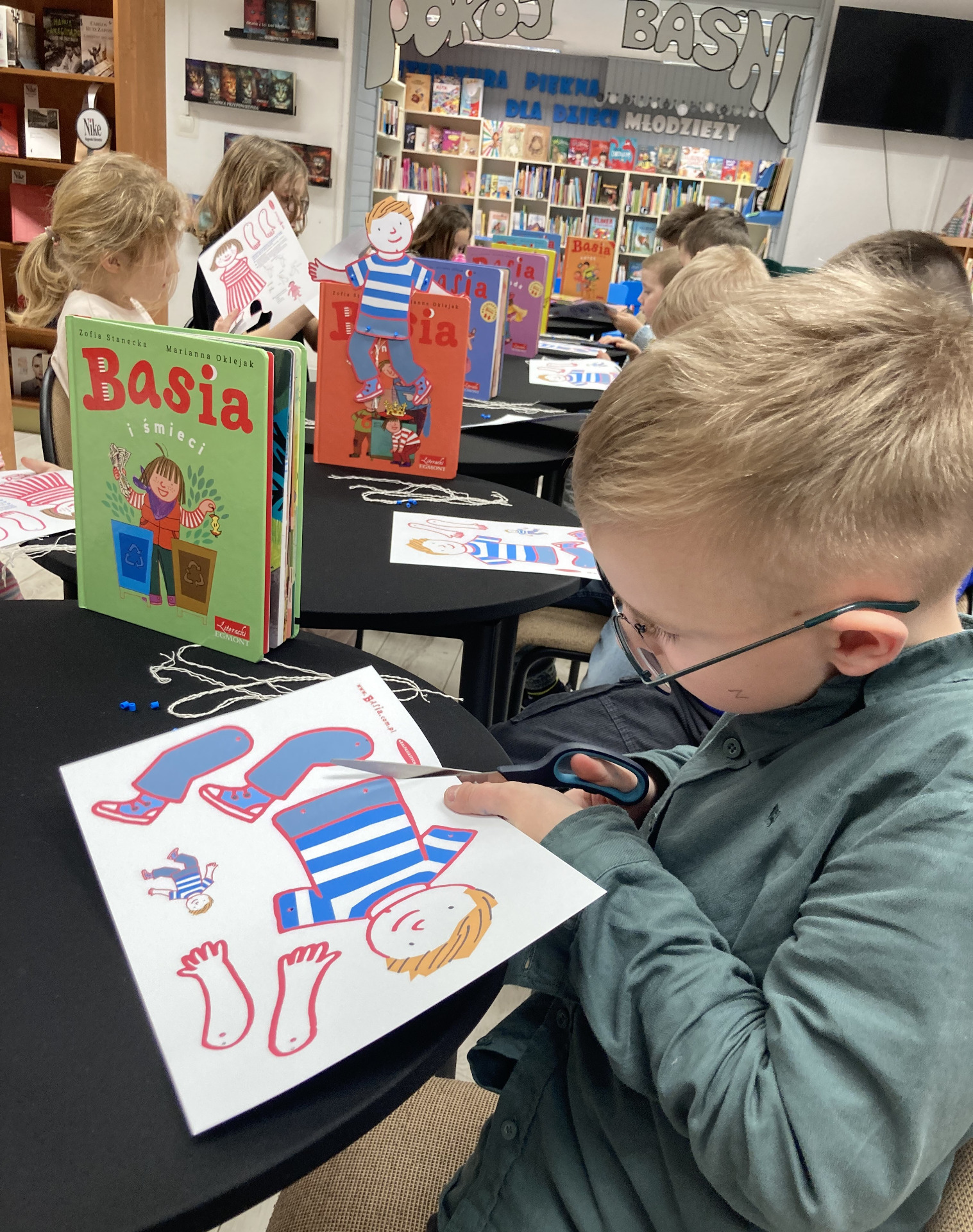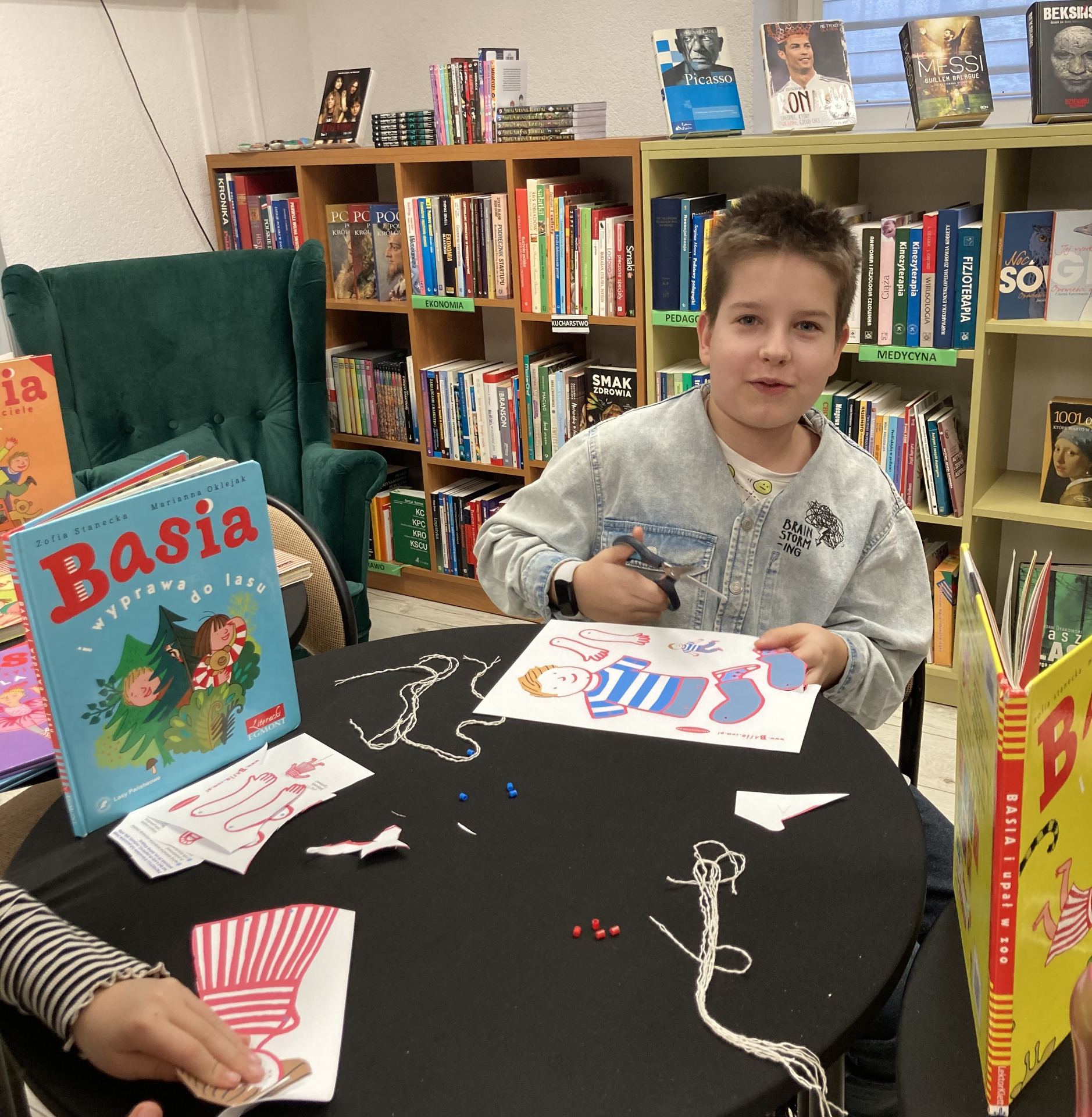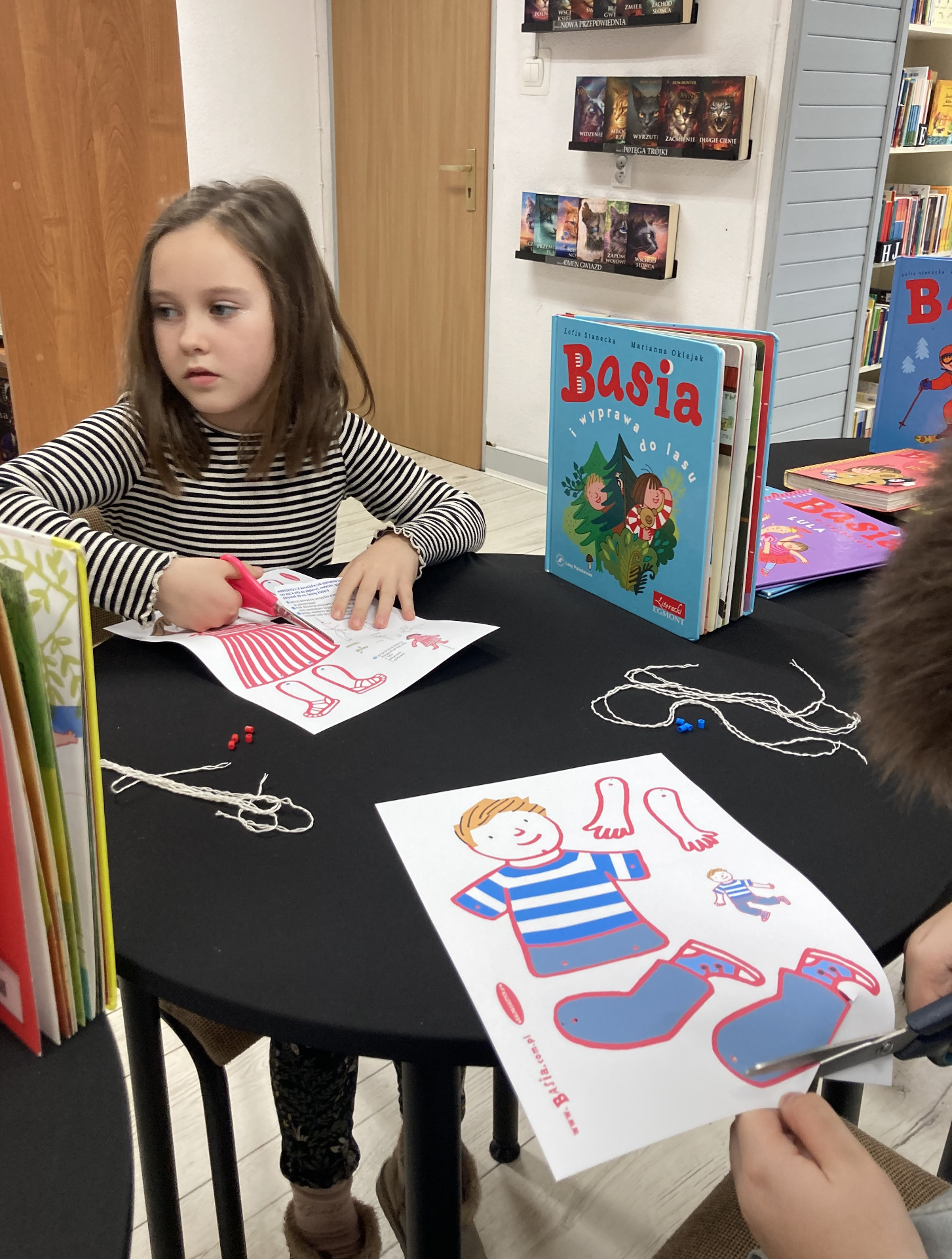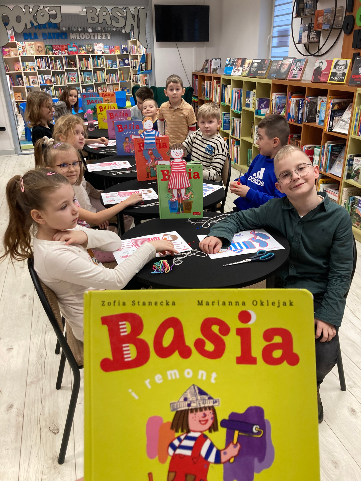 W piątkowe popołudnie odbyło się wyjątkowe spotkanie w Dyskusyjnym Klubie Książki dla Dzieci. W tym dniu uczestnicy klubu poznali tytułową bohaterkę serii książek Zofii Staneckiej – Basię. Dzieci przybyły na zajęcia ubrane w paski, jak ich tytułowa bohaterka. W trakcie spotkania dzieci miały okazję zapoznać się z różnymi przygodami Basi, która zmaga się z problemami bliskimi młodym czytelnikom: z rodzeństwem, pierwszymi przyjaźniami i codziennymi dylematami. Po dyskusji na temat książek o Basi, dzieci zaczęły kreatywną część spotkania – warsztaty tworzenia bohaterów interaktywnych. Z papieru i sznurka , stworzyły postacie Basi i jej brata Janka. Największą atrakcją warsztatów była możliwość ożywienia stworzonych postaci – za pomocą specjalnych mechanizmów, dzieci mogły poruszać rękami i nogami swoich papierowych bohaterów. Taki sposób tworzenia postaci sprawił, że każda Basia i Janek stały się nie tylko elementem zabawy, ale również pomocą w rozwijaniu wyobraźni i kreatywności dzieci.