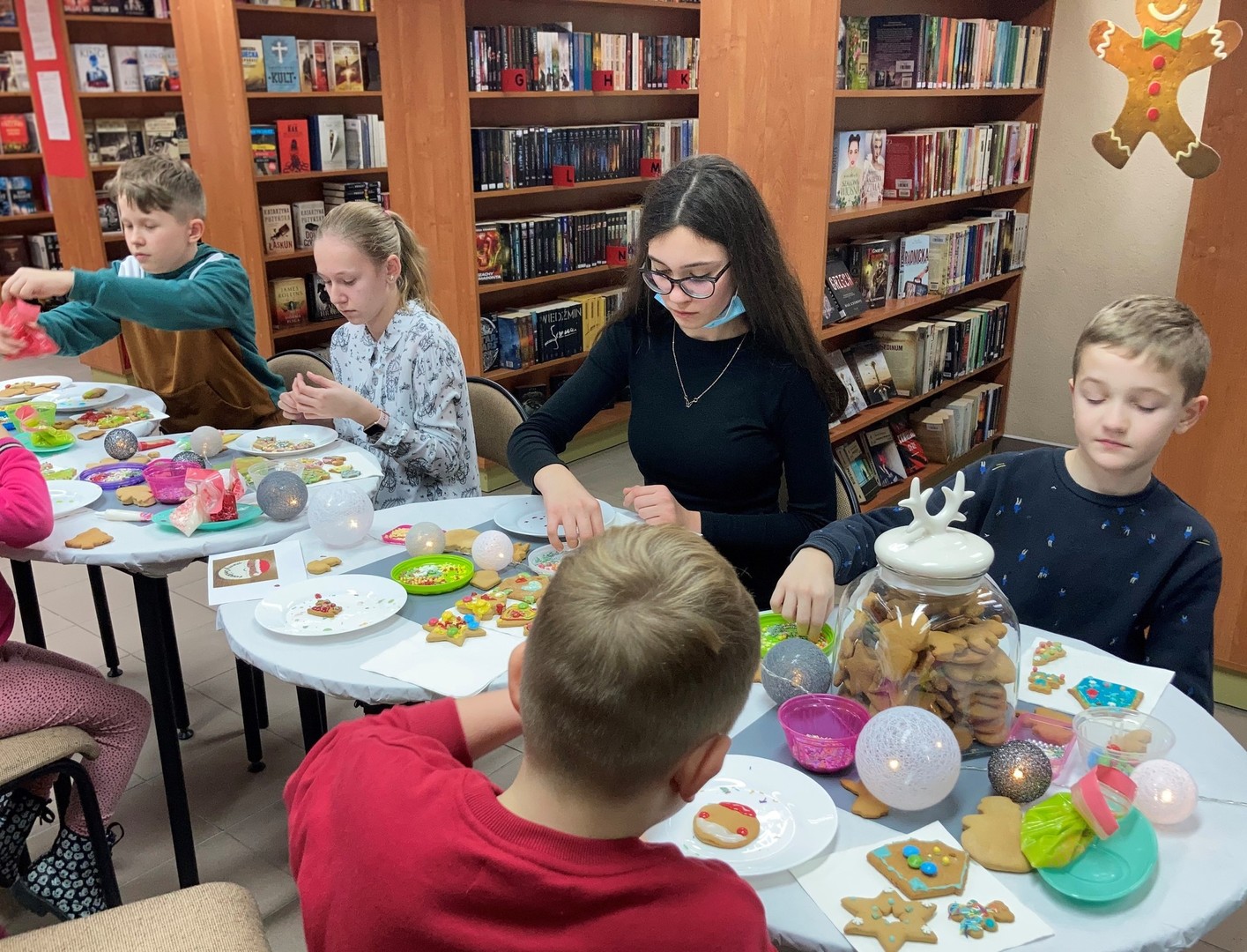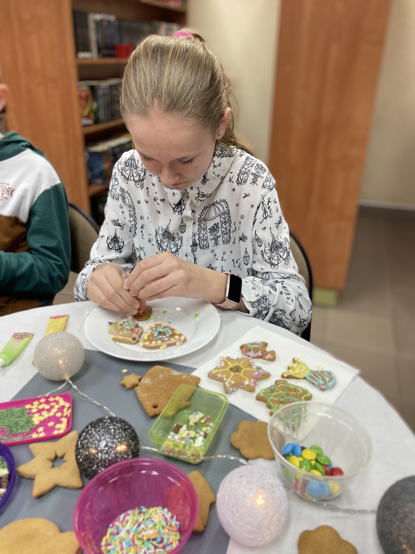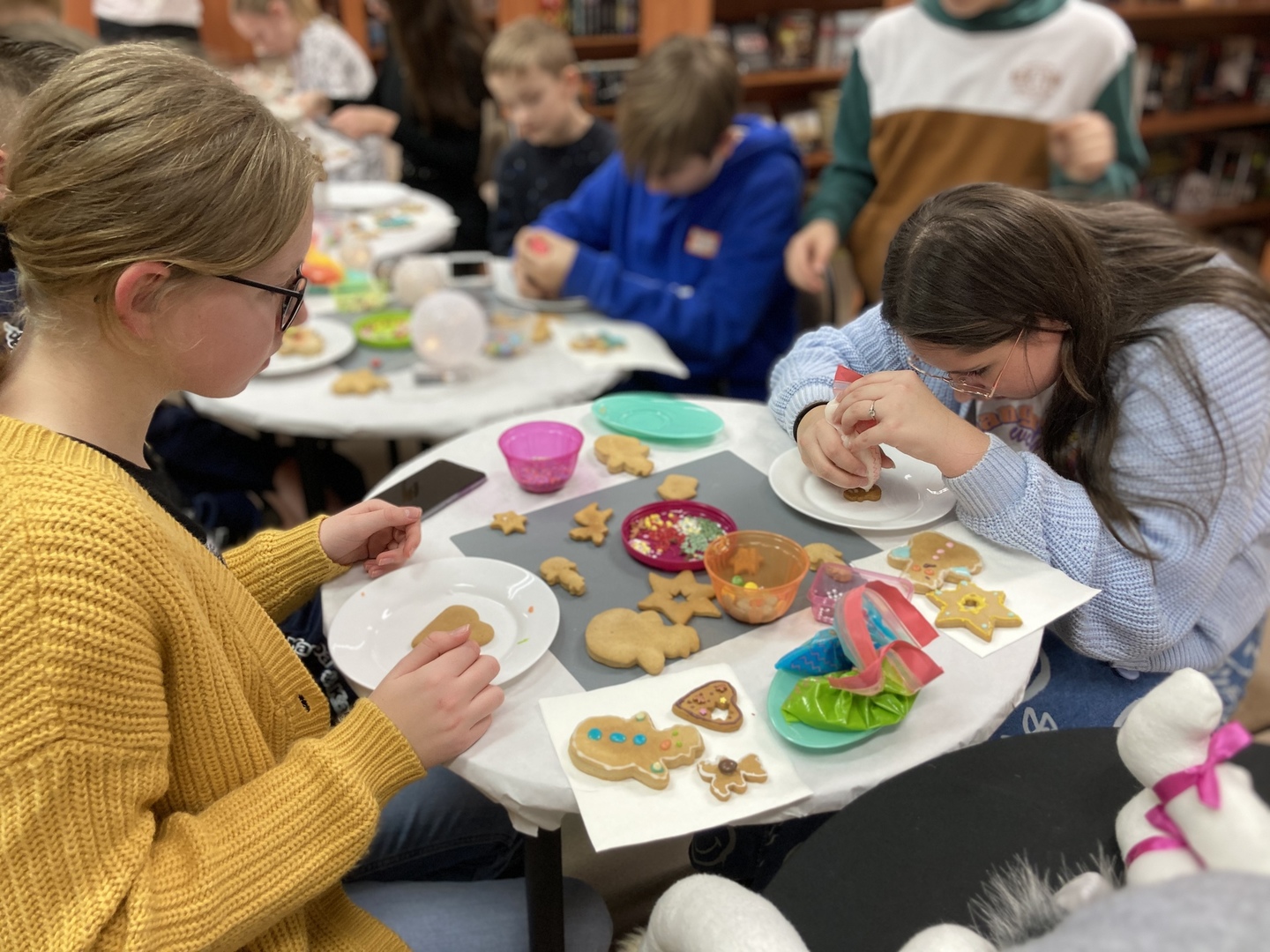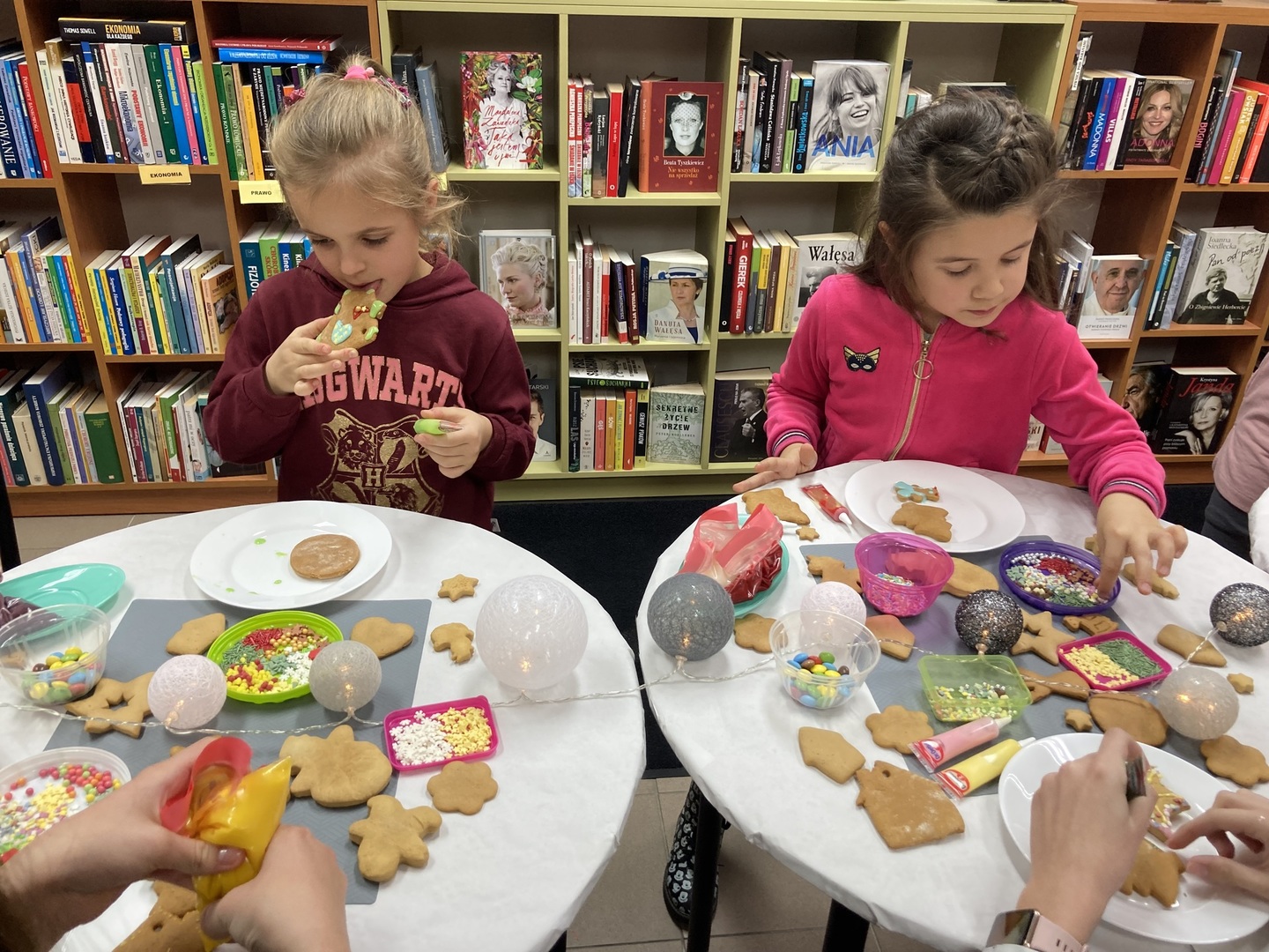 W drugiej części spotkania odbyły się warsztaty dekorowania pierników. Dzięki ogromnej wyobraźni i kreatywności Klubowiczów powstały niezwykłe dzieła piernikowe. W bibliotece unosił się zapach cynamonu, goździków, kardamonu, było bardzo słodko i smacznie…