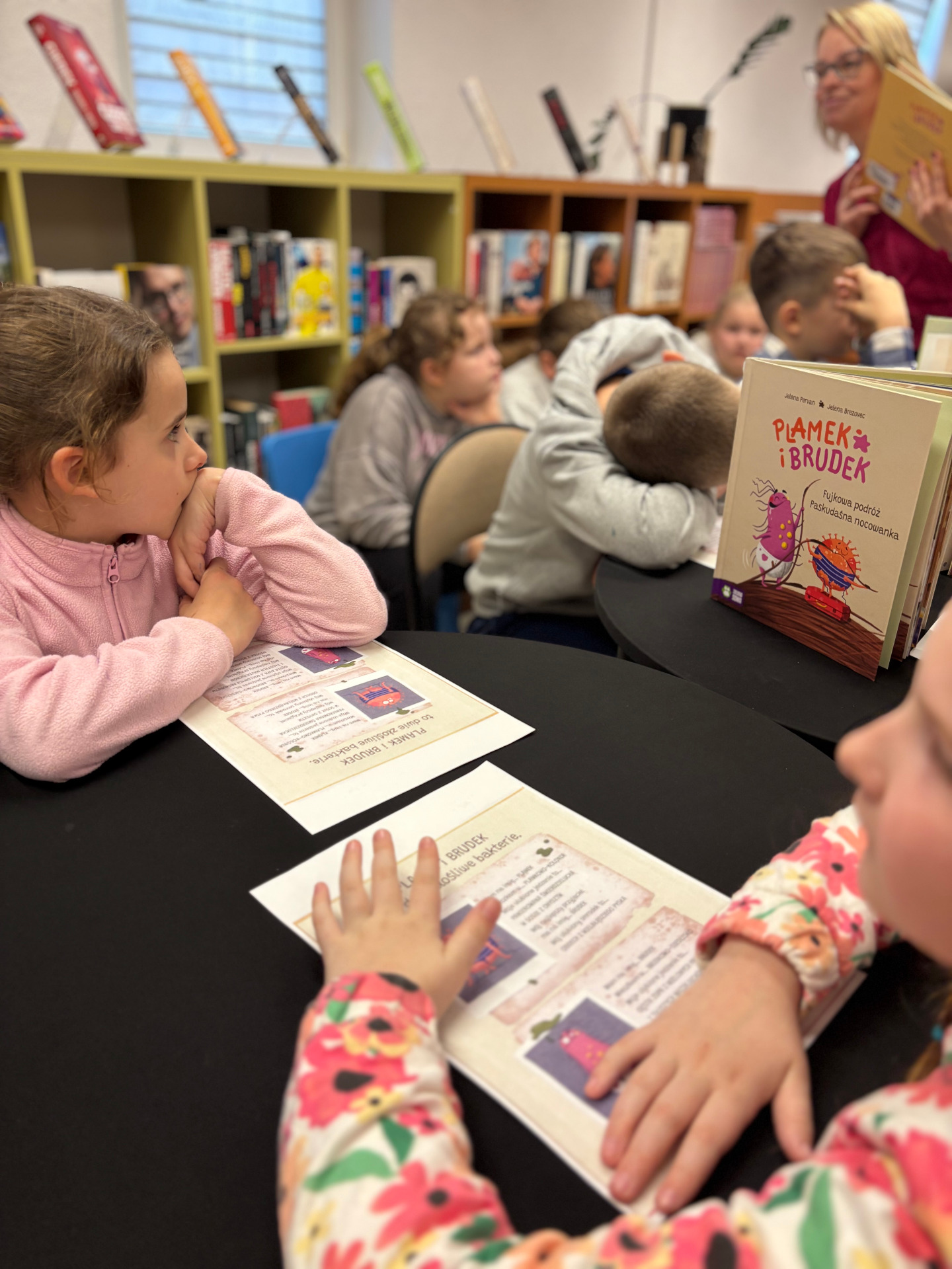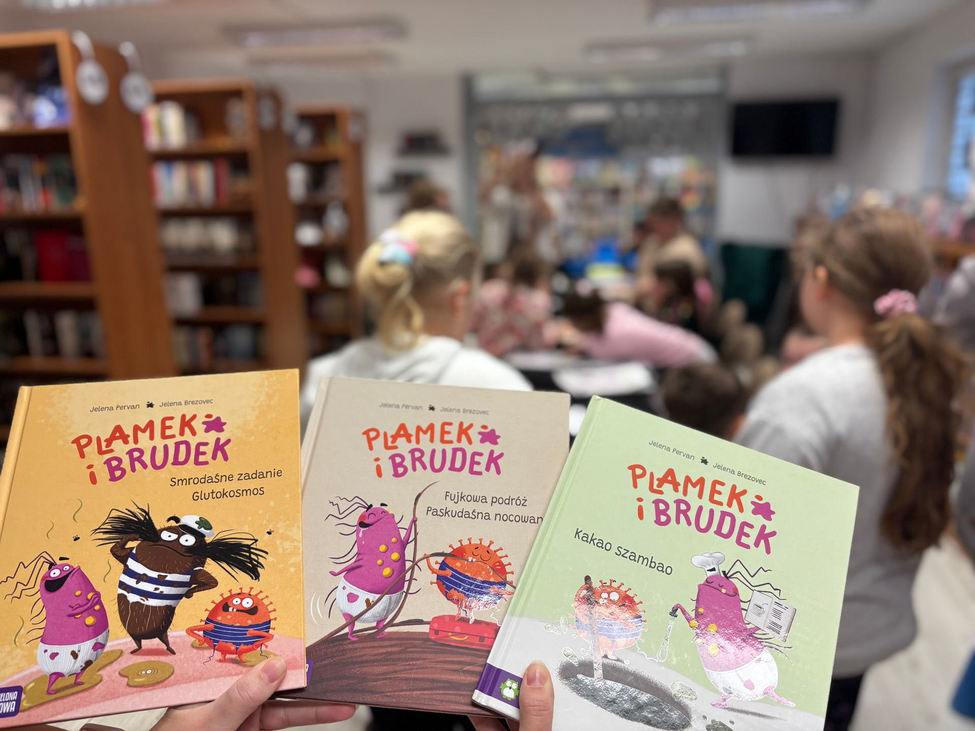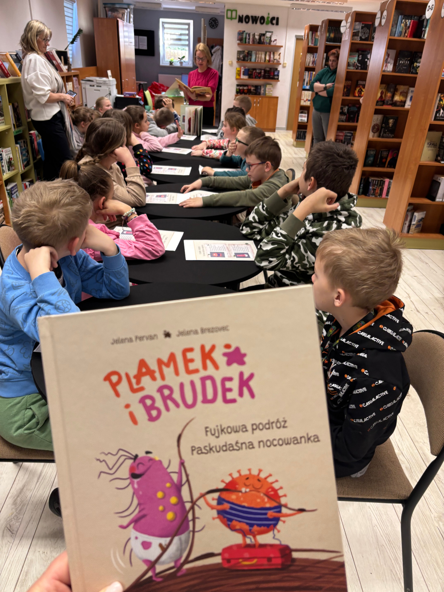 W naszej bibliotece odbyło się fantastyczne spotkanie, które prowadziła pani Joanna Witkowska z Miejskiej Biblioteki Publicznej w Darłowie. W spotkaniu uczestniczyli uczniowie klas I-III z Zespołu Szkół w Korlinie. Dzieci miały okazję poznać niezwykłe książki z serii Plamek i Brudek autorstwa Jeleny Pervan . Bohaterami opowieści były dwie złośliwe bakterie, które uwielbiają wszystko, co smrodliwe, paskudne i glutaśne. Ich celem jest zbliżenie się do dzieci, które zaniedbują higienę – nie myją rąk ani zębów, nie czeszą włosów, nie lubią zmieniać skarpetek. Książka, będąca nie tylko zabawną, ale i edukacyjną opowieścią, skutecznie uczyła dzieci, jak wielkie znaczenie ma codzienna troska o czystość i higienę osobistą.