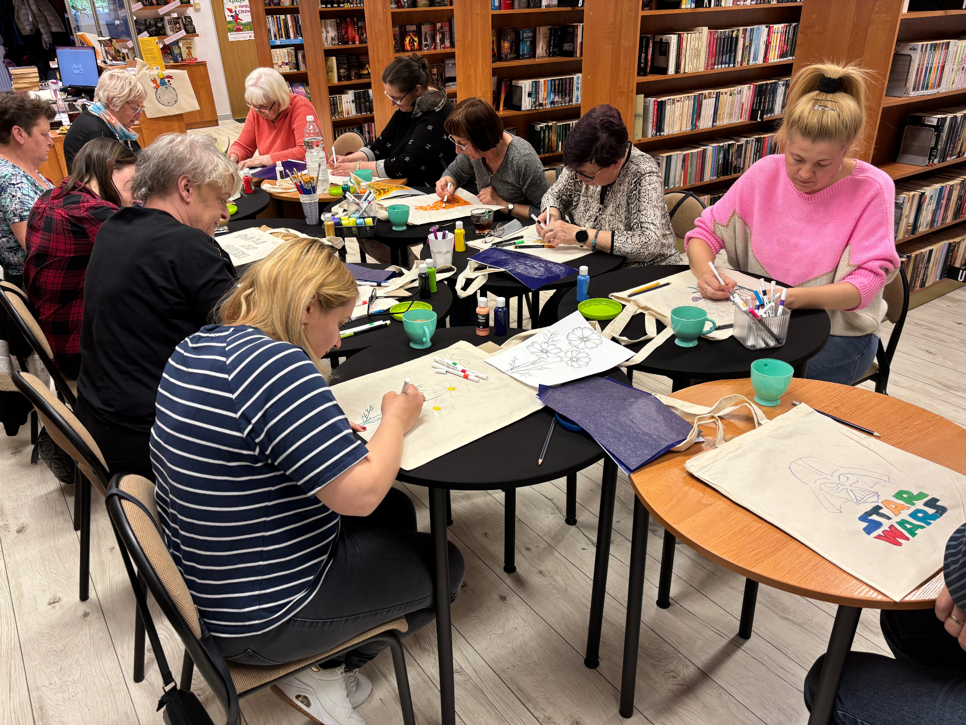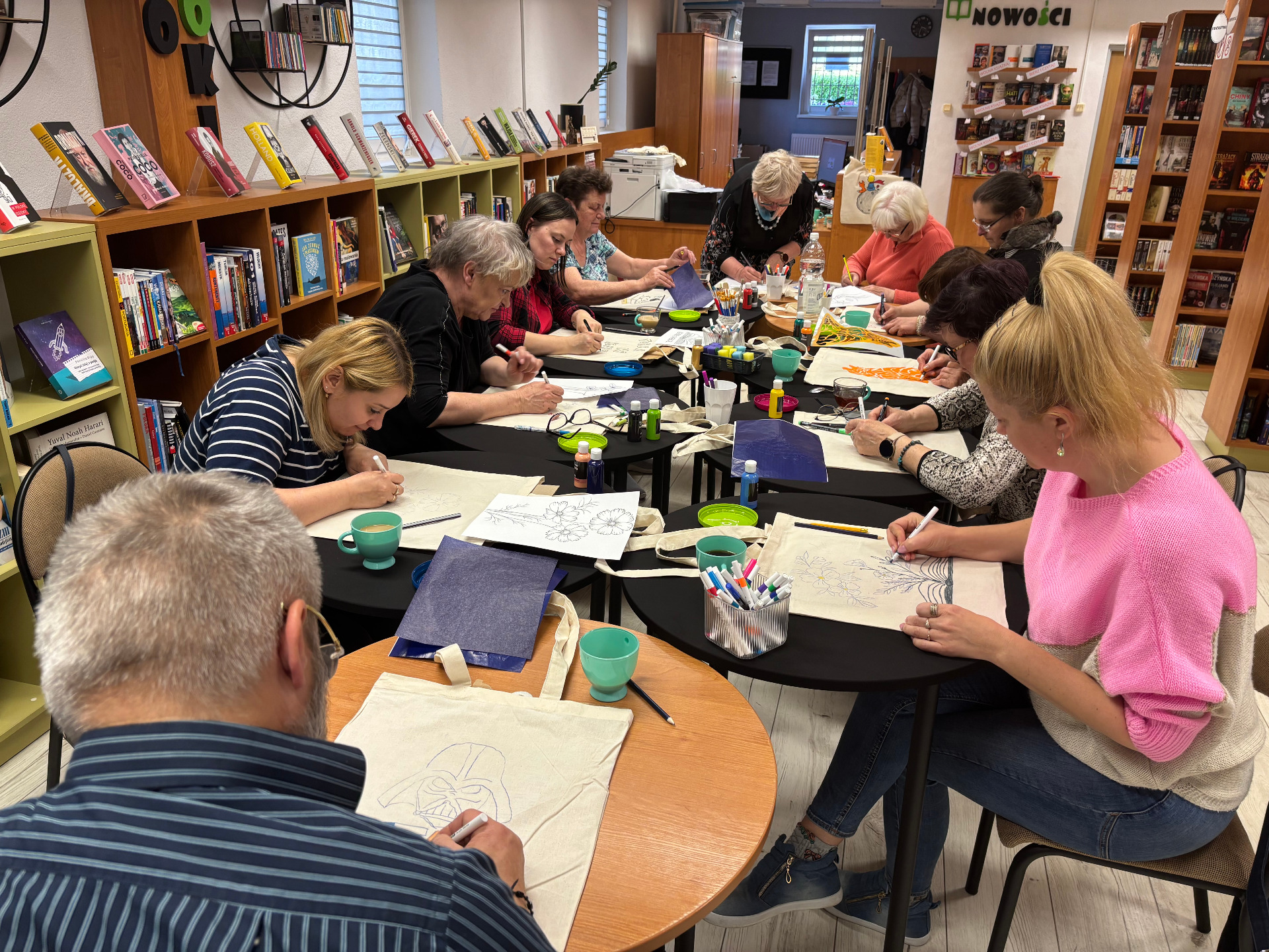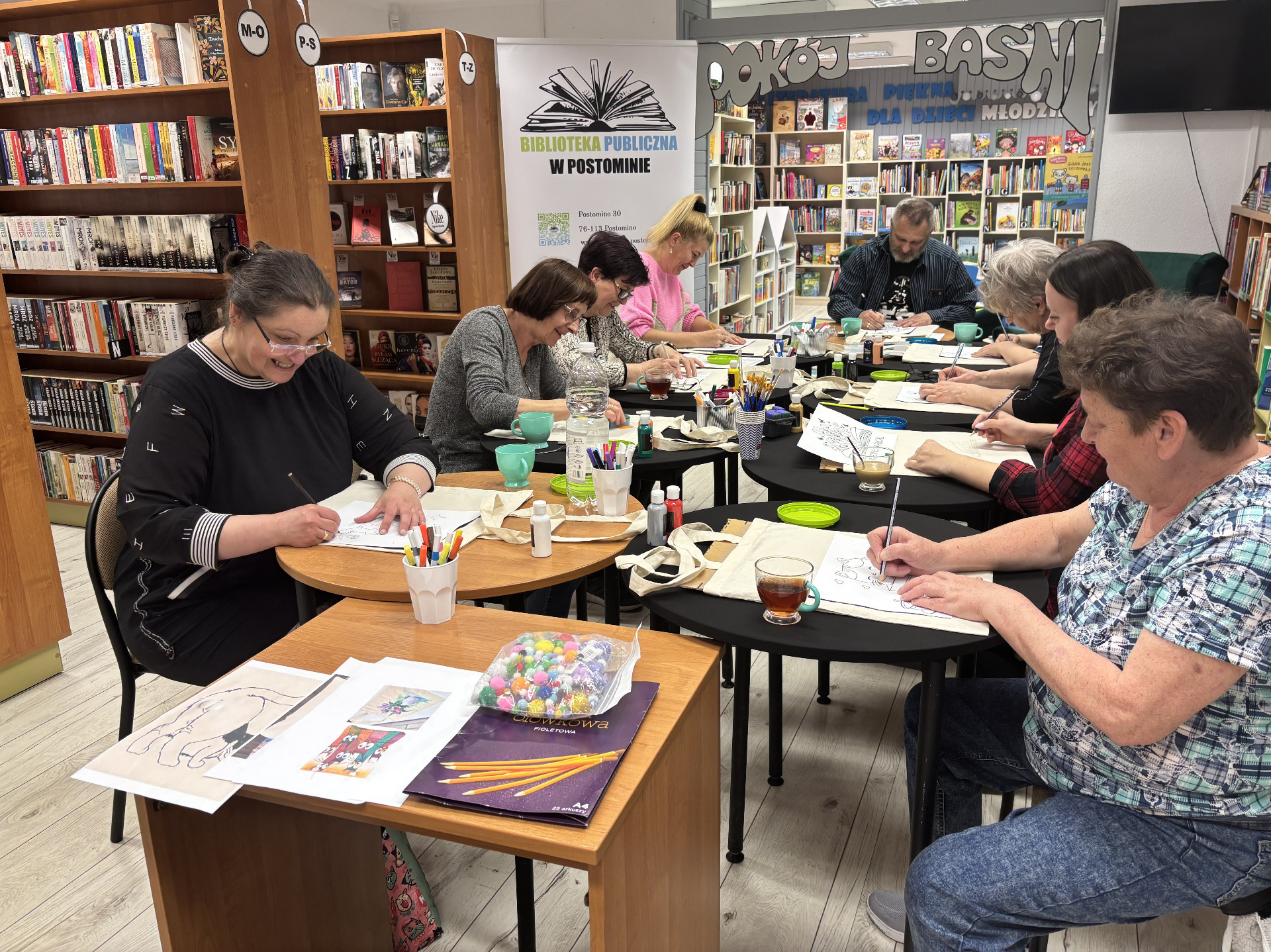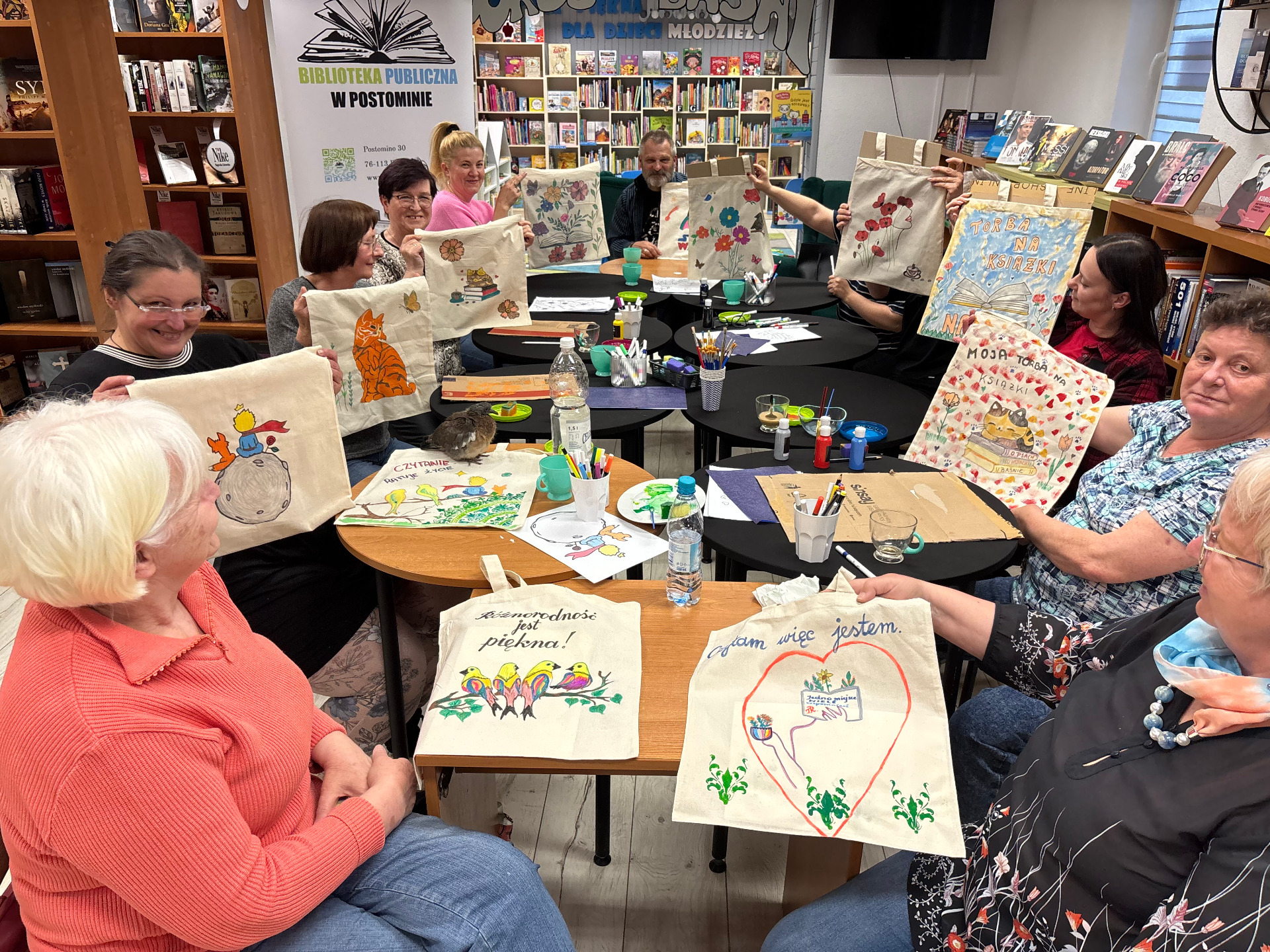 W Bibliotece Publicznej w Postominie odbyły się warsztaty twórcze dla dorosłych pod hasłem „Zmalujmy coś razem”. Spotkanie miało na celu połączenie kreatywnej aktywności z relaksem i integracją. Uczestnicy - niezależnie od doświadczenia artystycznego tworzyli własne torby na książki, wykorzystując specjalne farby i markery do tkanin.