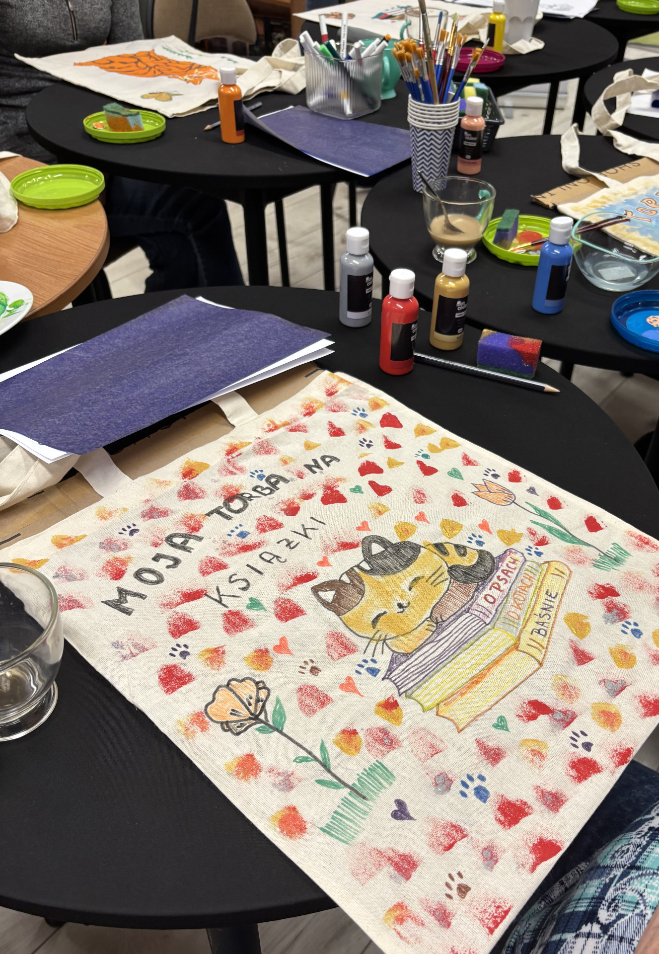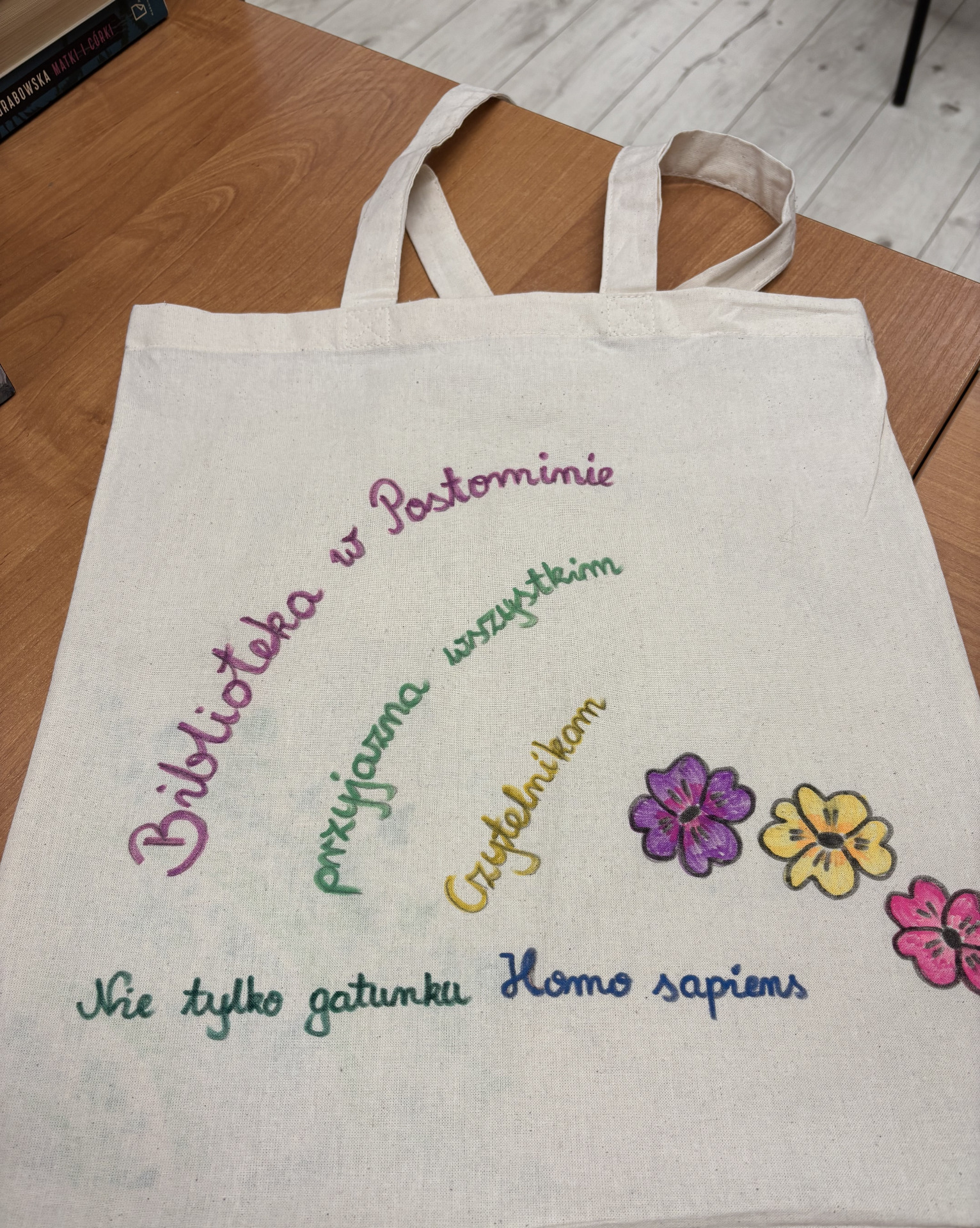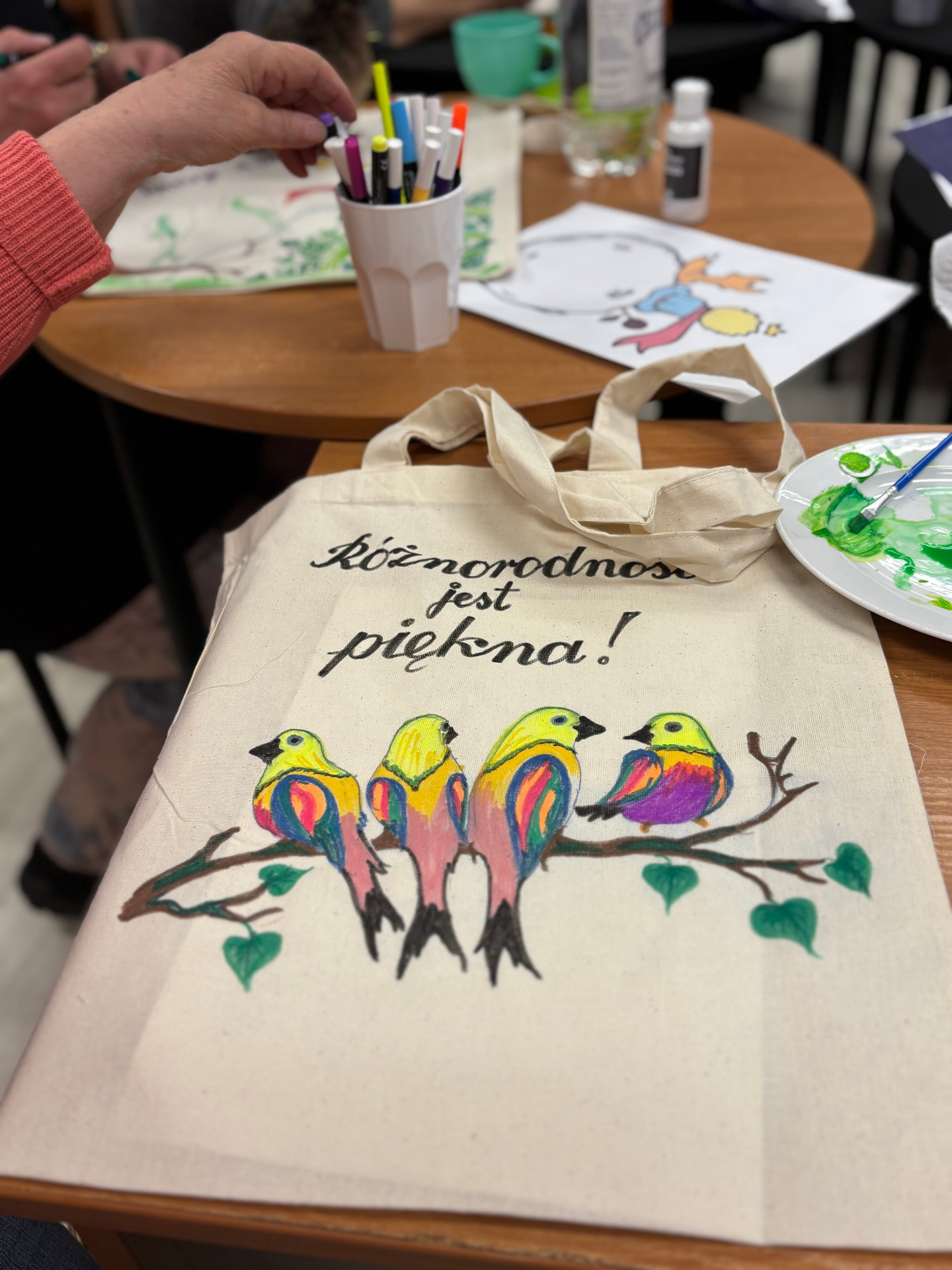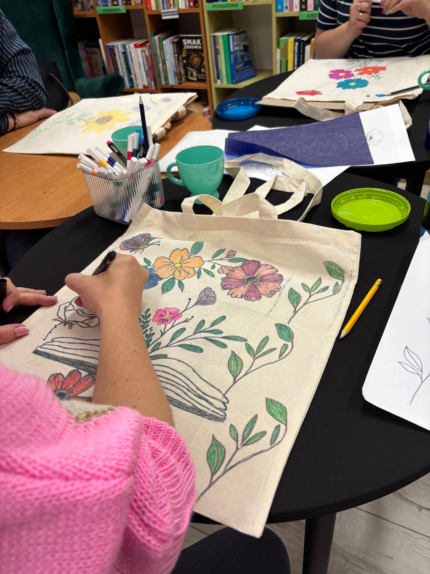 Zajęcia sprzyjały swobodnej twórczości – nie było sztywnych zasad ani presji na efekt. Każdy mógł zaprojektować i ozdobić torbę według własnego pomysłu. Powstały prace bardzo różnorodne – od minimalistycznych kompozycji, przez kolorowe, ekspresyjne motywy, aż po torby z hasłami promującymi czytelnictwo. Dla wielu uczestników był to nie tylko ciekawy sposób na stworzenie czegoś własnego, ale też chwila wytchnienia od codziennych obowiązków.