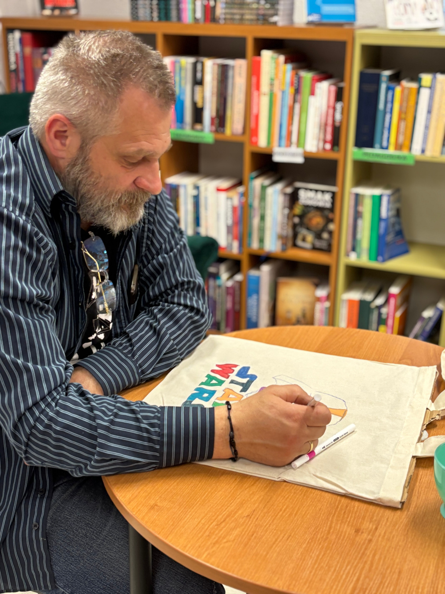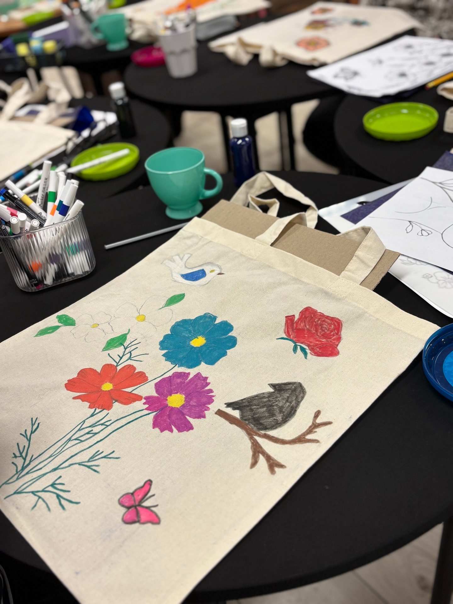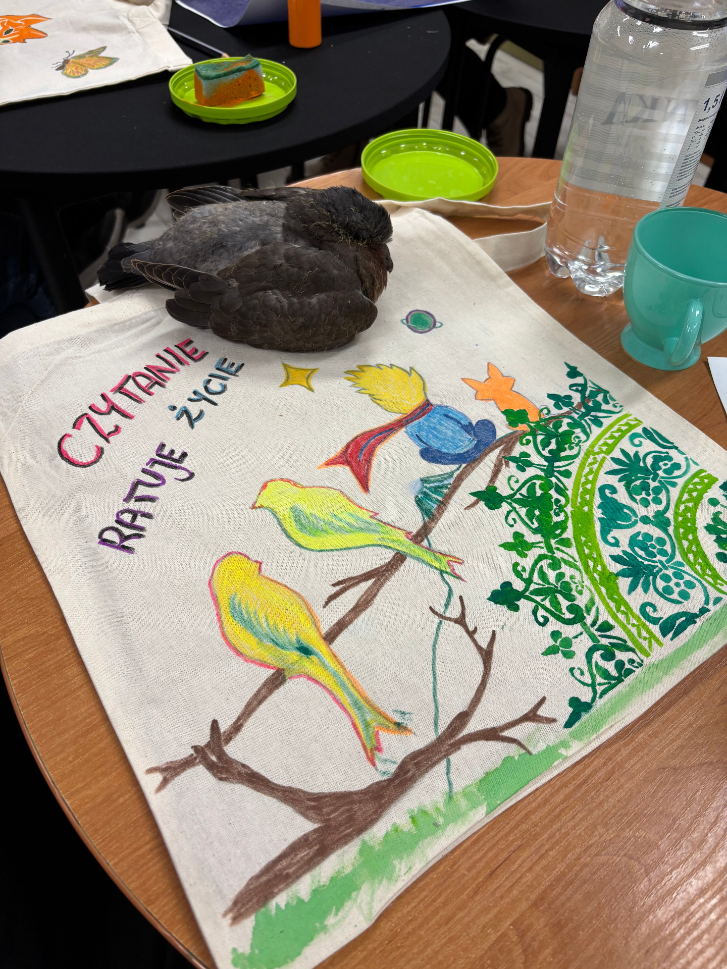Zajęcia sprzyjały swobodnej twórczości – nie było sztywnych zasad ani presji na efekt. Każdy mógł zaprojektować i ozdobić torbę według własnego pomysłu. Powstały prace bardzo różnorodne – od minimalistycznych kompozycji, przez kolorowe, ekspresyjne motywy, aż po torby z hasłami promującymi czytelnictwo. Dla wielu uczestników był to nie tylko ciekawy sposób na stworzenie czegoś własnego, ale też chwila wytchnienia od codziennych obowiązków.