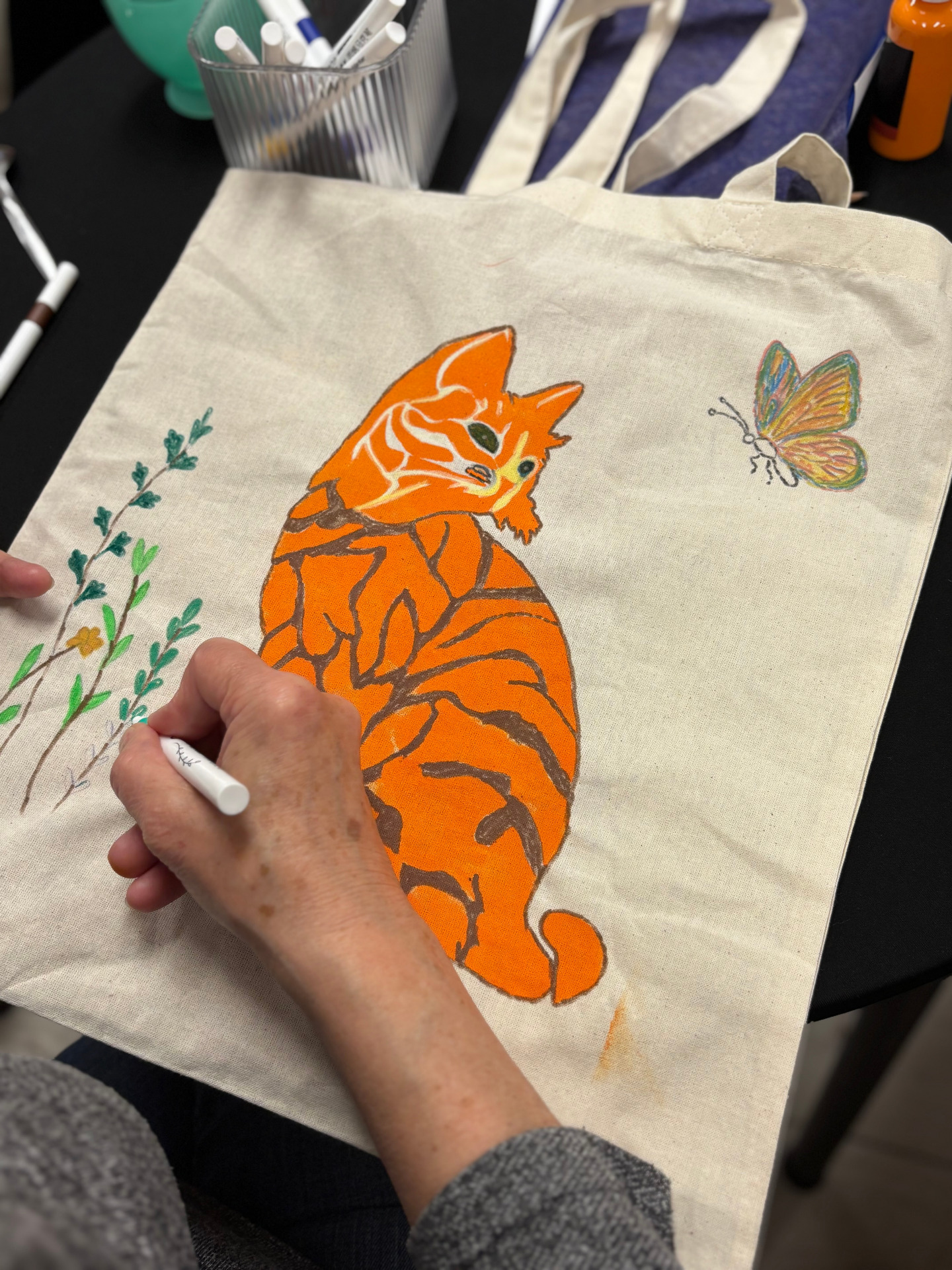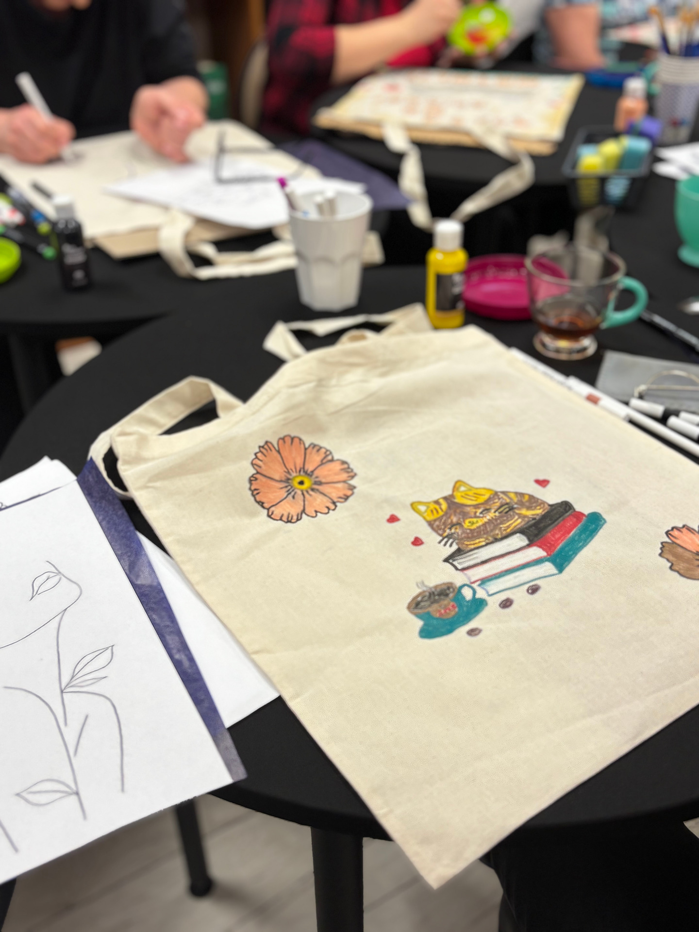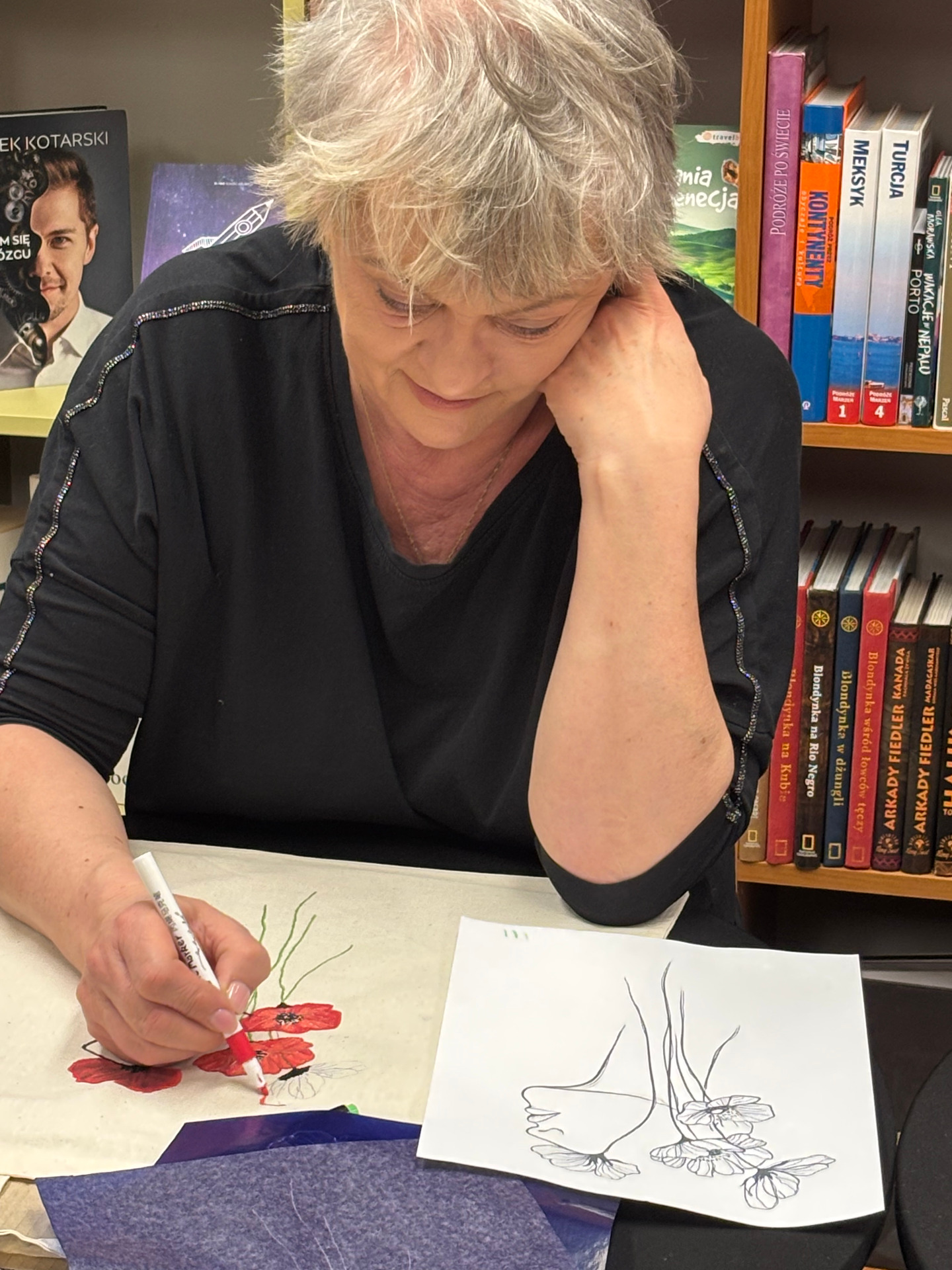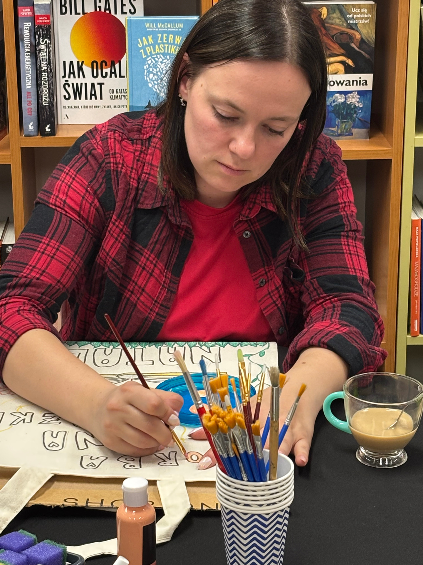 Zajęcia sprzyjały swobodnej twórczości – nie było sztywnych zasad ani presji na efekt. Każdy mógł zaprojektować i ozdobić torbę według własnego pomysłu. Powstały prace bardzo różnorodne – od minimalistycznych kompozycji, przez kolorowe, ekspresyjne motywy, aż po torby z hasłami promującymi czytelnictwo. Dla wielu uczestników był to nie tylko ciekawy sposób na stworzenie czegoś własnego, ale też chwila wytchnienia od codziennych obowiązków.